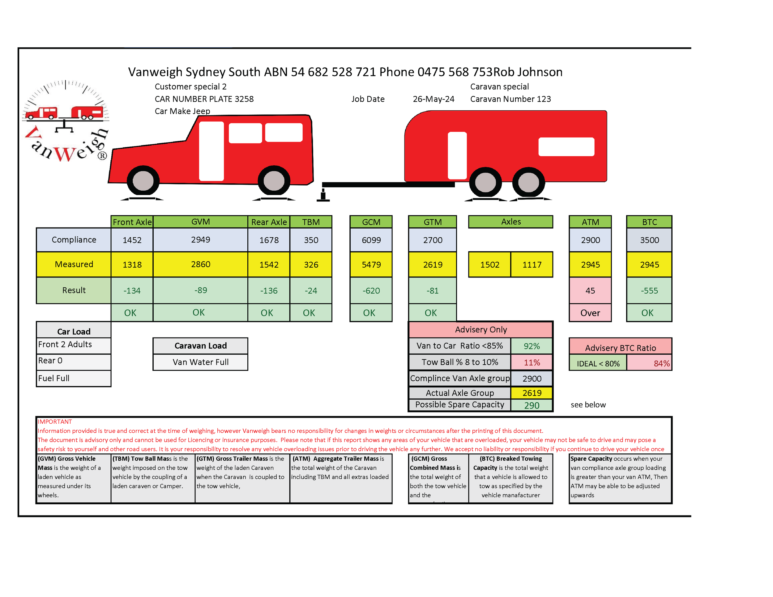 Our Professional Tow Vehicle & Caravan Weigh Includes: